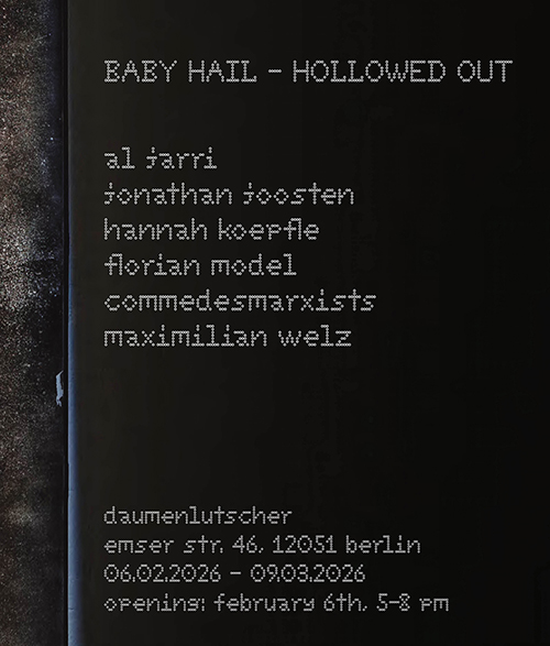 Daumenlutscher is again appplying to 48 neukeoln 2026 with this concept for OPEN FORMAT HOW TO GET OUT OF HERE Hannah Koepfle Artists and creative people are constantly on the run, whether they know their destination or their destiny.. they run.. Run, Run, Run. Daumenlutscher is pleased to work with old and new talents and artists who understand that art is more than just picking up trash from the internet or the streets, or some art school. It is more than just “I can do this as well”. They look for something beyond trauma, recycling and noise. They are interested in process that depends on reflections and myriads of hesitations that land in the margins before they cross the threshold to a world that seems too far or too alienated and too impossible to reach. They exhaust themselves in propositions with coldness and a cool that vanishes the popular sense of existing. Art is a process that reaches beyond the regular fast done job and depends on consistency and loyalty over decades to land in nowhere land when not supported by a net work of people who really love and believe in fine art or a national network of institutions that believe in an ideology that tries to correct politics. Daumenlutscher has two locations that are used to provide a place for artistic and cultural experimentations without the slightest hint of what should be the result. Daumenlutscher has learned the hard way, the politics is everywhere and nowhere and hence…. not a place to believe in from a purely artistic perspective albeit of what really can’t be ignored. Lesson number one in Berlin is that independence has a huge price. “To get out of here” is more than just a topographical question but also a temporal and one that has justice at the “vertige” point - translate the French word not wiht VERTIGO but get beyond the anxious void that so many cannot face . (artist list subject to change