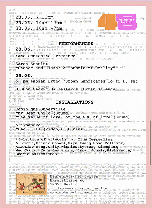 summer - september ---- pictures are coming soon .... after the court case summer camp and exhibition by Yuqiu Mao, Zhiming Yu followed by an exhibition in fall opening september; INSTAGRAM: DAUMENLUTSCHER_BERLIN +491775935899 DURING WAR times NO PICTURES ON LINE - ASK FOR IT In Frame of 48h Neukölln Cedric Ballesteros, Yanka Smetanina, Fabian Drung, Sarah Schultz, Dominique Suberville, Aleksandra "Breaking the Silence: Exploring Urban Soundscapes,"