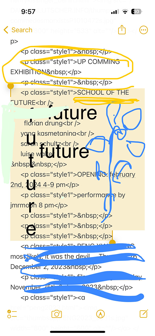 CURRENT SHOW - February 2024 - gallery open every saturday SCHOOL OF THE FUTURE OPENING: february 2nd, 2024 4-9 pm performance by jmrmoon -- comming up