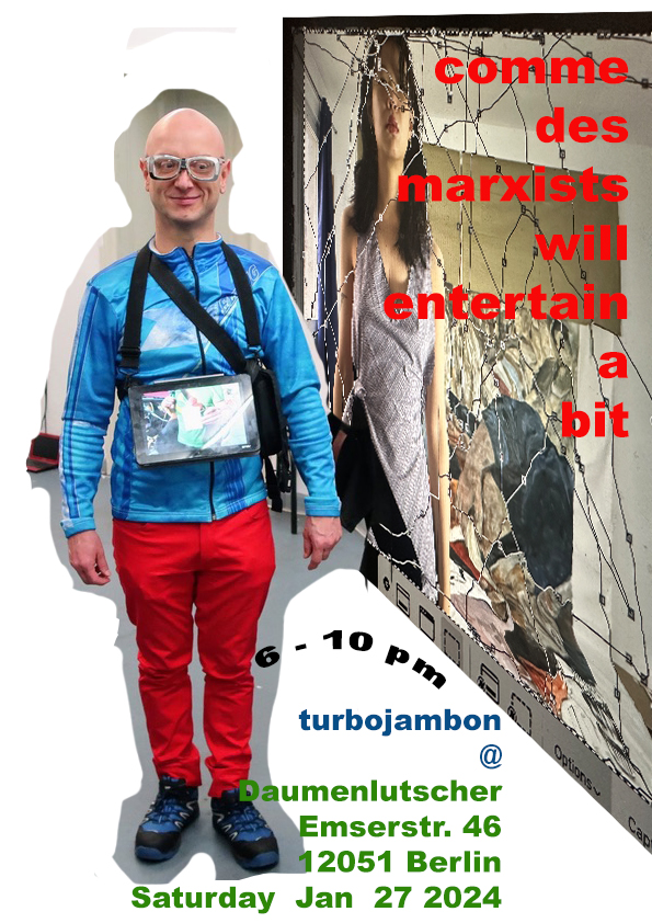 COMMEDESMARXISTS Konzept und Kurzbeschreibung - Short descrition - dt - english Daumenlutscher ist eine internationale Plattform für Diskussionen auf verschiedenen Ebenen: Kunst, Musik, Mode, Performances, Poesie- und Filmveranstaltungen. Wir denken archivarisch. Wir moegenkleinere Formate. Keine Blasphemie, keine Materialinteraktionen. Wir fragen, was ist nachhaltiges Denken und praktisches Kunst-Leben ? Wir handeln wie diskursiven Sprechakte in verfremdeten Formaten. Sprachliche, philosophische und kreative Freundschaften und Loyalität sind Korum und Anstand unserer Diskussionen, die Formen annehmen und nicht gleich zu Beginn fragen. Was ist Kunst, Wie kann Kunst das Töten Menschen für Profit verhindern? Warum ist der Preis für Seltene Erden höher als angegeben? Coolness mit coolen Tools in Sachen Bildschirmpräsenz finden wir weniger cool, wenn es um unser Klima geht. Wir sind nicht laut, aber fleissig und manifestieren Vielfältigkeit im Umgang aller Materialien und Medien. Der Mensch reprasentiert für uns das größten Kapital, das jede Gesellschaft bieten kann, aber nie wirklich bietet: Eine freie und mutige Gesellschaft Zeit – wir sind spät dran, aber wir schaffen es irgendwie. Als Slow-Grow-Aktivisten drehen wir uns wie Spinnen. Die Galerie wird von Künstlern für Künstler betrieben und delegiert frei und ohne die Hektik eines White Cubes. Daumenlutscher is an international platform for discussions on various levels: art, music, fashion, performances, poetry and film events. We think in archival terms. We like smaller formats. No blasphemy, no material interactions. We are exploring sustainable ways to make art and live work somehow together, We act like discursive speech acts in alienated formats. Linguistic, philosophical and creative friendships and loyalty are the hallmarks of DEMOCRACY and decency in our discussions, which take on forms and do not ask right at the beginning: What is art? How can art prevent the killing of people for profit? Why is the price of rare earths higher than stated? We find coolness with cool tools in terms of screen presence less cool We focus also on climate questions and recycling. We are not loud but experiment wiith diversity in the way we use all materials and media. For us, people represent the greatest asset that every society can offer, but never truly delivers: a free and courageous society. Time – we're late, but we're somehow making it. As slow-growth activists, we spin like spiders. The gallery is run by artists for artists and delegates freely and without the hustle and bustle of a white cube.