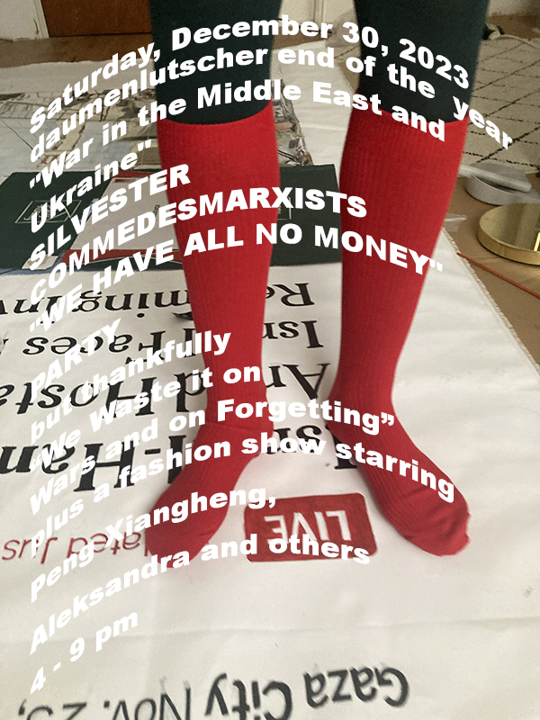 Saturday, December 30, 2023-- daumlutscher end of the year "War in the Middle East and Ukriane" SILVESTER COMMEDESMARXISTS "WE HAVE ALL NO MONEY" PARTY but thankfully We Waste it on Wars and on Forgetting --- plus a fashion show starring Peng Xiangheng, leksandra and others 4 - 9 pm