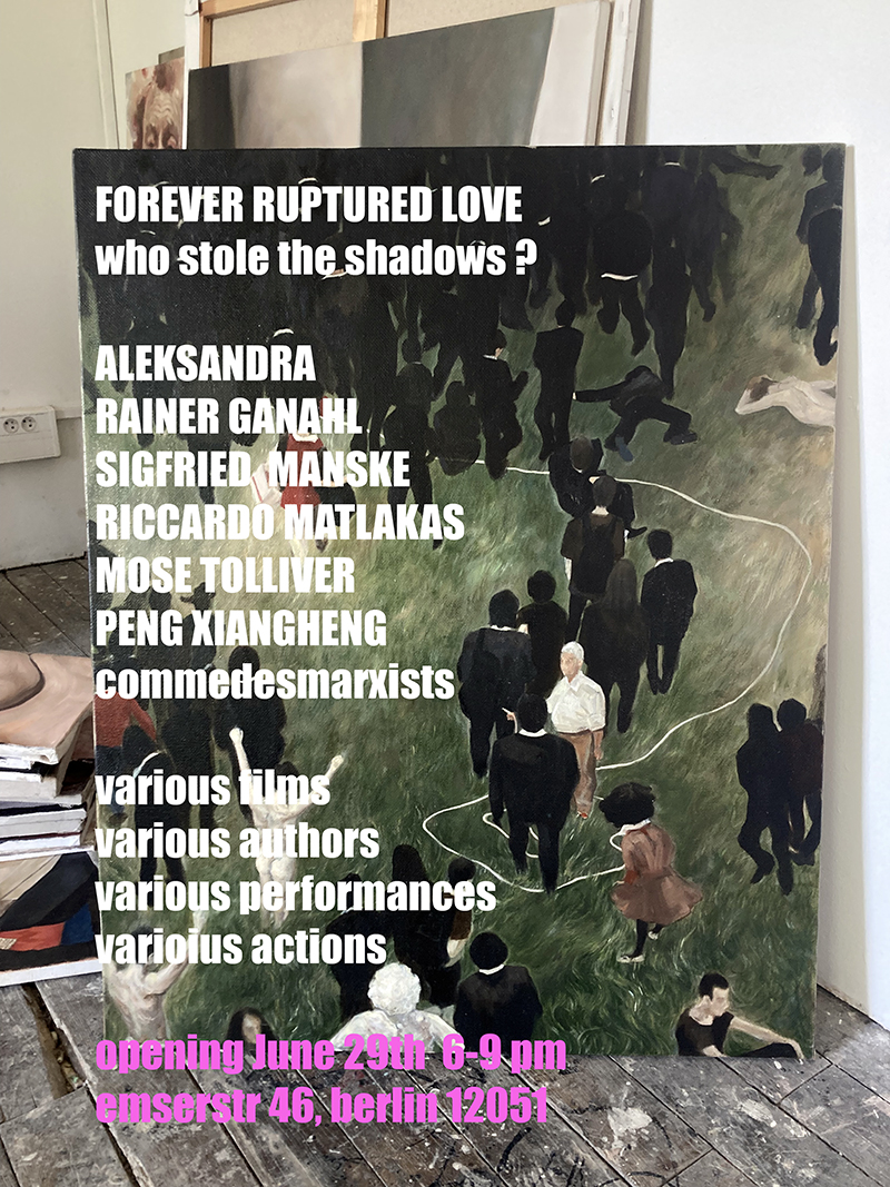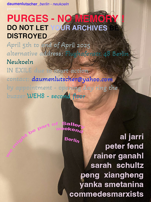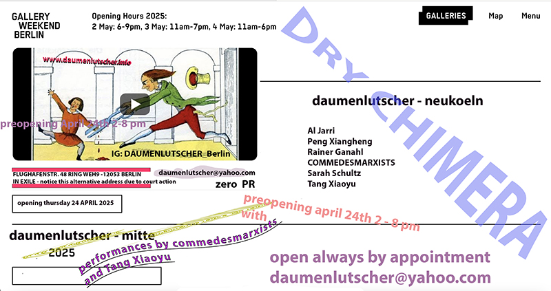 the law action opened a period of reflection and we fell deep into the geography of Europe. We landed in Vienna We called it officially on the web site and also in personal live : SILENCE IS SEXY ... and remember one thing : fascism can be broken when people look each other in the eyes and trust each other withou an attempt to discrespect, to exploit, to kill and abuse each other. Covid was terrible on the economic and on the psychology of people and hence the ongoing of sensless wars in the east of Europe, and in the Middle east and in the heads of people ---- (the terrible impact and devision of the US elections since 2016 /// and its consequences.... and the impact of economic development and shifts and this endless demand for expansion without any serious attempt to act against climate change) is still deviding us. THE MISSION OF DAUMENLUTSCHER IS TO BRING PEOPLE AND COMMUNITIES TOGETHER so truth can be told, and communities can help each others accross massive barriers. silence and got accomodated in Vienna by one of the artist of daumenlutscher. daumenlutscher Vienna (images are coming soon ) A bar of a gallerist gave Rainer Ganahl and Comme des Marxist a short case and the private apparment served as a site of discussion over war and peace and how to eat healthy. THE SECOND STOP DAUMENLUTSCHER WENT WAS PARIS - where the artist Peng Xiangheng allowed his partner to experience a very productive collaboration since Peng and Ganahl have pledged to a wow for life no matter how dire and disgusting the world around them can be and perceive them. Peng has become the exclusive model and actress for Ganahl and Peng also started to produce a film on the artist and his ordeal to stay afloat against all odds. walks and collaborations will be posted soon. The couple - Peng Ganahl - has become the driving motor to push the gallery forward and they prepared the new event space in Berlin as well as curated a summer residency at the old space to the Chinese couple YUQIU MAO and Zhiming Yu. (more images of the show itself coming soon) but see below current show in the alternative show is here - pictures coming soon. upcoming show -- purging - coming as well at the new location.