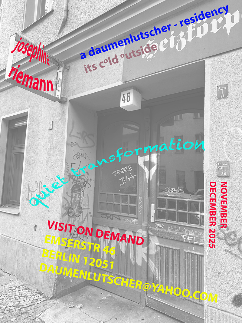 current show opening early November 2025 JOSEPHINE RIEMANN - EMSERSTR. 46, Berlin Neukoeln - showing of work will be upon request